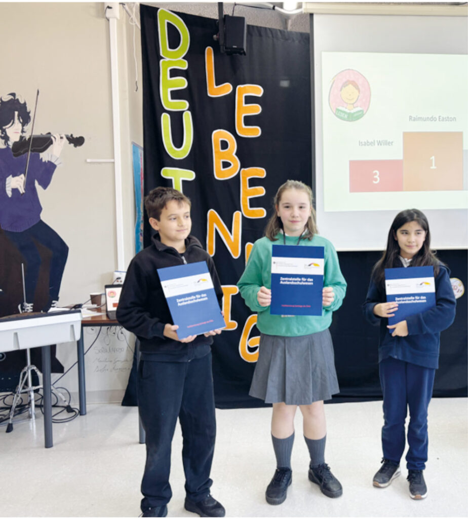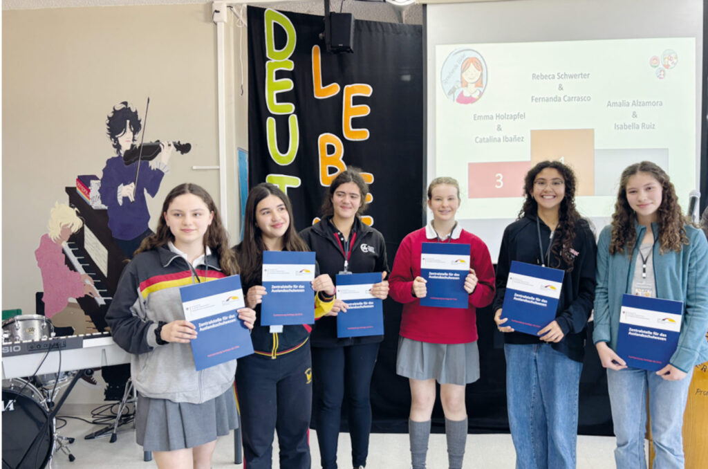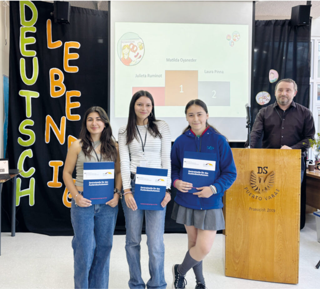 Los ganadores del concurso «Deutsch lebendig» 2025 demostraron excelentes conocimientos de alemán: En la categoría de lectura en voz alta, Raimundo Easton del Colegio Alemán de Chicureo obtuvo el primer lugar. En la categoría «Imágenes que hablan» ganaron Rebeca Schwerter (Colegio Alemán de Temuco) y Fernanda Carrasco (Colegio Alemán de La Serena). En el formato «Pecha Kucha», Matilda Oyaneder del Colegio Suizo de Santiago destacó con su presentación y alcanzó el primer lugar.